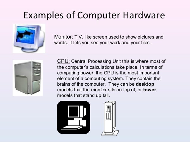 Computer hardware includes the physical, tangible parts or components of a computer, such as the cabinet, central processing unit, monitor, keyboard a combination of hardware and software forms a usable computing system, although other systems exist with only hardware components.