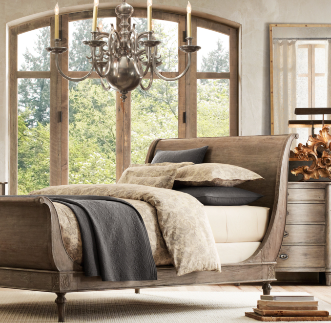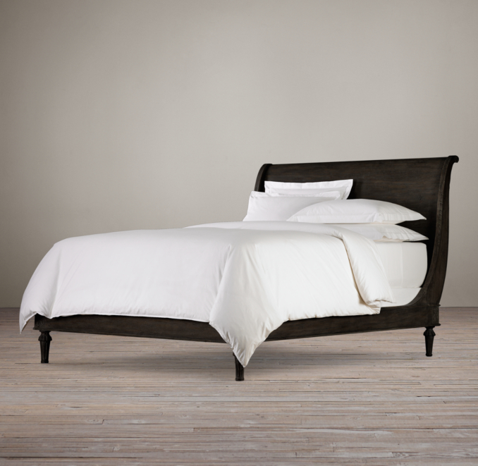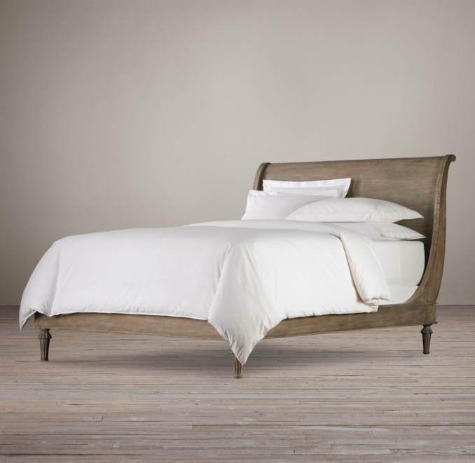 11+ Restoration Hardware Empire Rosette Sleigh Bed Pics. James sleigh bed with footboard. Monochromatic bedroom with restoration hardware chesterfield sleigh bed without footboard layered with white bedding topped with a folded taupe coverlet and a pair of gray ikat dot pillows with matching ivory three drawer nightstands on either side topped with regina andrew milano mercury.